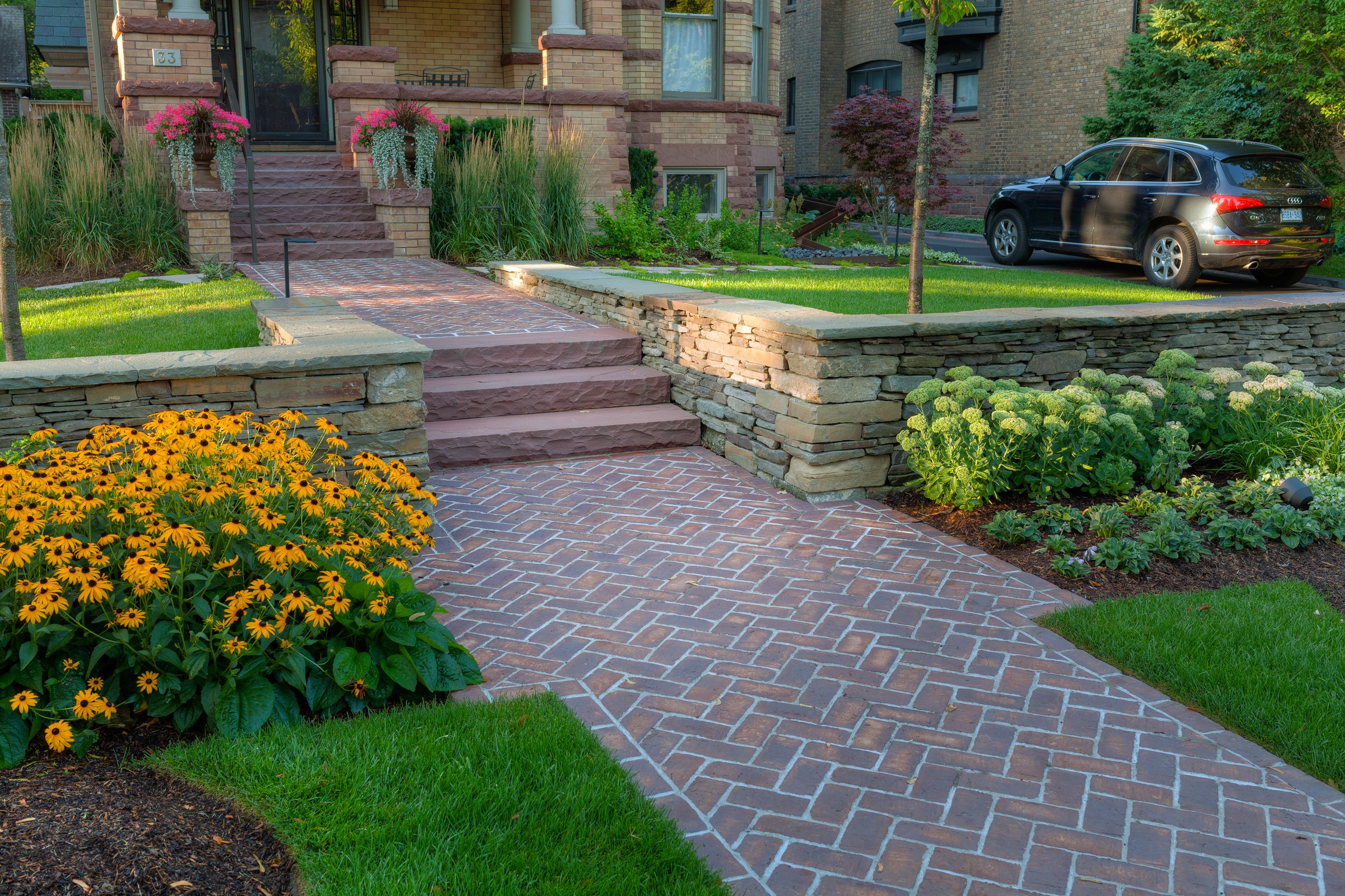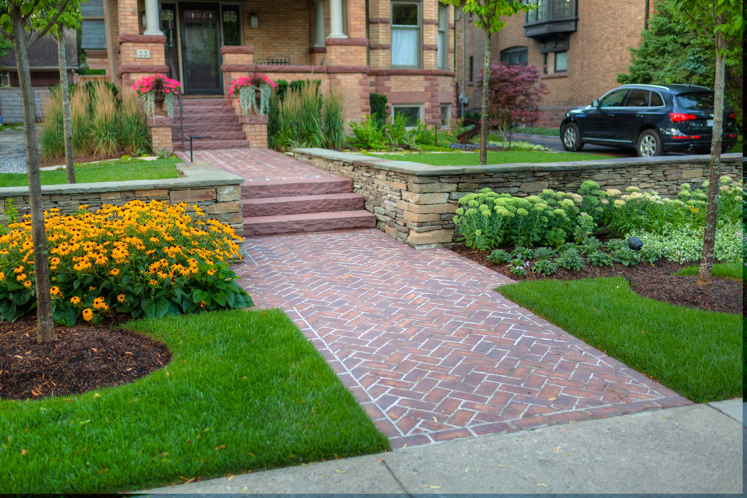 Allweather Landscape was approached by the High Park Blvd client to construct a landscape that would tie in with the charm of the house and the history of the neighbourhood. The designs from Martin Wade Landscape Architects were sublime and the Allweather team executed them to perfection. The charm and history of its surroundings were achieved by handcrafting the dry-stacked rubble wall that flanks the front yard. Endicott clay pavers created an entrance walk to the new credit valley slab steps that lead you to the front door. The brick pillars were rebuilt to an exact match, seamlessly tying in the old with the new.
